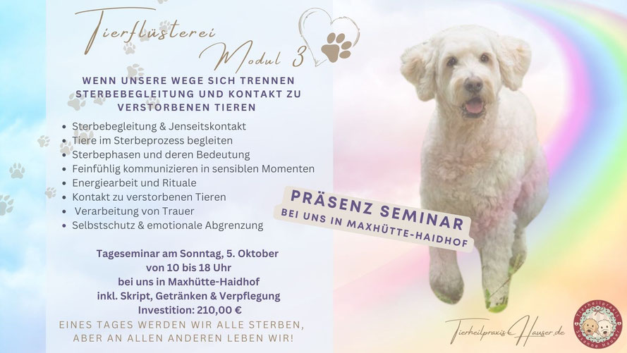 In diesem Teil der Ausbildung erfährst du, wie du Tiere und ihre Menschen in dieser Übergangszeit liebevoll begleitest und auch im feinstofflichen Kontakt klare, tröstende Botschaften
